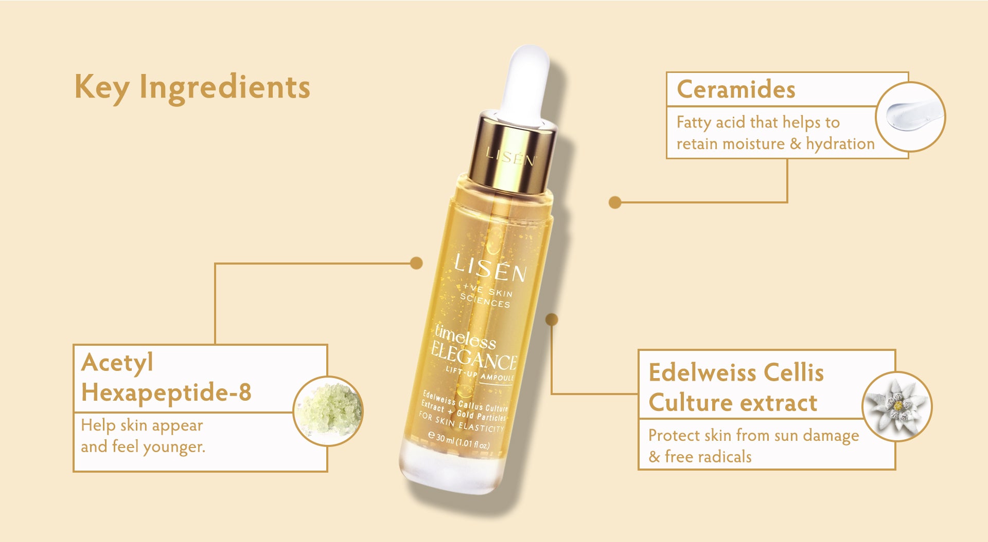 - With Ceramides, Peptides, Hyaluronic Acid, Adenosine and Niacinamide, Timeless Elegance is a revolutionary formula that fortifies and restructures the skin barrier, encouraging the renewal and regeneration of skin cells so skin instantly looks more lifted and firmer.